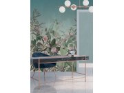 Bohatý květinový vzor s texturou připomínající tapiserie. Podklad tyrkysový s jemnou látkovou strukturou.