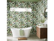 Luxusní vliesová tapeta s exotickými rostlinami v pestrých barvách na bílém podkladu.