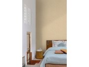 Vliesová tapeta s květinovým vzorem, obrysy z plastického jemně hebkého flocku. Podklad hladký, zlato-béžový pololesk, obrysy bílé.