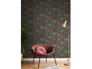 Bohatý květinový vzor s texturou připomínající tapiserie. Podklad je fialový pololesk s jemnou látkovou strukturou. Vliesová tapeta, povrch vinylový.