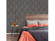 Luxusní tapeta tmavě šedá s měděným geometrickým vzorem na strukturovaném povrchu imitující hrubou textilii.