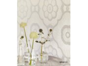 Odvažte se a pořiďte si netradiční luxusní tapetu. Výrazný květinový vzor tvořený stříbrnými linkami a drobnými skleněnými perličkami. Podklad světle béžový metalický.