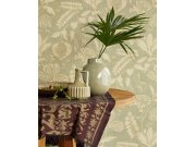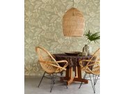 Vliesová tapeta s vinylovým povrchem - imitace hrubě tkané látky s botanickým batikovaným efektem v tlumených zeleno-šedých tónech, vzor béžový.