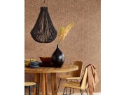 Geometrický vzor na podkladu v designu hrubé textilie s jemně plastickou nepravidelnou texturou tvořící pruhy. V odstínech hnědé. Podklad vlies, povrch vinyl.
