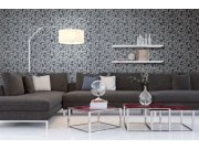 Vliesová tapeta s vinylovým povrchem. Lesklý černý ornamentální vzor na pololesklém černém podkladu. Plastická textura, pololesk.