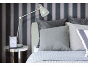 Vliesová tapeta s vinylovým povrchem. Pololesklé pruhy v odstínech temně modré a stříbrné.