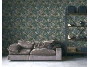 Design tropických listů, podklad netradiční jemně plastický geometrický vzor v odstínech pololesklé hnědé a tyrkysové. Snadno zkombinujete se souvisejícími vzory. Podklad vlies, povrch vinyl.