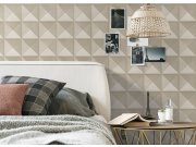 Šíře role 1m. Vliesové tapety s vinylovým povrchem, inspirované přírodou. Jemně plastický povrch tapety ze střídavých textur tvoří nepravidelné obdélníky. Odstíny šedo-stříbrné a hnědo-zlaté s jemným pololeskem. Netradiční vzor tapety ozvláštní každý inte