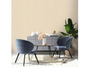Luxusní béžová vliesová tapeta s vinylovým povrchem, hrubší proužky a rozdílně textury tvoří geometrický vzor. Foto interiéru je pouze ilustrační - odlišné barvy.