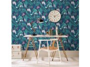 Luxusní vliesová tapeta s exotickými rostlinami v pestrých barvách na tmavě modrém podkladu.