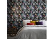 Luxusní vliesová tapeta s motivem květin, motýlů a ptáků v pestrých barvách na tmavě šedém podkladu.