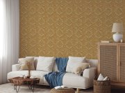 Jemně plastická vliesová tapeta s vinylovým povrchem, imitace hrubší tkaniny v odstínech okrovo-zlaté, ornamentální vzor v okrové a stříbrné. . Co vás zaujme: kvalita zpracování, vysoká odolnost. Design: klasický, moderní. Úroveň tapetování: pro začátečn