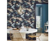 Luxusní vliesová tapeta s motivem lotusů a vodního ptactva v tyrkysové a béžové barvě na černém podkladu.