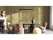 Luxusní vliesová tapeta s vinylovým povrchem, plastické motivy palmových listů, odstíny pololesklé béžové, metalické zlaté a zelené.