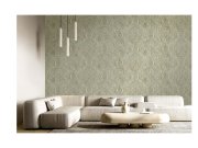 Jemně plastická šedobéžová vliesová tapeta s vinylovým povrchem, motivy květin s nádechem do zelena, látková textura.