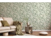 Jemně plastická šedobéžová vliesová tapeta s vinylovým povrchem, motivy květin s nádechem do zelena, látková textura.