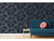 Luxusní modrá vliesová tapeta s vinylovým povrchem, motivy listů v odstínech bronzové.