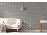 Luxusní, šedo-stříbrná, geometrická vliesová tapeta s vinylovým povchem. Kovový pololesk, výrazná textura, vzory hexagonů. Hexagon cca 10cm. Foto interiéru je pouze ilustrační - odlišné barvy.