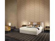 Šíře role 0,7m. Luxusní vliesová tapeta s vinylovým povrchem, výrazně plastická textilní struktura tvoří geometrický vzor, v odstínech pololesklé hnědo-zlaté a bronzové. Barvy se mění podle dopadu světla. Snadno zkombinujete se souvisejícími vzory.