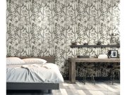 Bílá vliesová tapeta na zeď s geometrickým podkladem a metalickým vzorem bambusu.