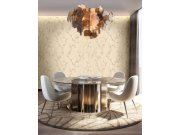 Luxusní vliesová tapeta s vinylovým povrchem s neobvyklým vzorem - plastické vlnky a lístky v béžovém odstínu se stříbrným a zlatým vzorem větviček s květinami a lístky.