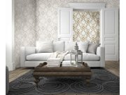 Luxusní jemně strukturovaná tapeta se zámeckým vzorem v béžových odstínech na šedém podkladu s perlovým leskem a zlatými efekty.