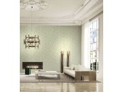 Luxusní vliesová tapeta s vinylovým povrchem s neobvyklým vzorem - plastické vlnky a lístky v zeleno-modrém odstínu se stříbrným vzorem větviček s květinami a lístky.