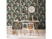 Luxusní vliesová tapeta s motivem květin, motýlů a ptáků v pestrých barvách na tyrkysovém podkladu.