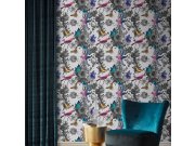 Luxusní vliesová tapeta s motivem květin, motýlů a ptáků v pestrých barvách na světle šedém podkladu.