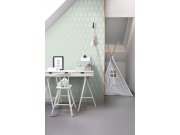 Luxusní vliesová geometrická tapeta na zeď s vinylovým povrchem, vzor koulí a polokoulí v odstínech mentolové a béžové barvy. Foto interiéru je pouze ilustrační - odlišné barvy.