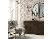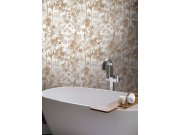 Metalická hnědá vliesová tapeta na zeď, výrazně plastické bílé listy.