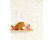 Dětská vliesová tapeta, bílý podklad, modrý ornamentální motiv květin a lesních zvířátek. Tapeta má látkovou texturu, je vhodná do dětského pokojíčku.