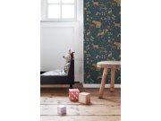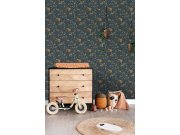 Tmavě modrá hladká vliesová tapeta na zeď, dětské vzory přírody a zvířátek v odstínech hnědé a zelené.