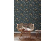 Hladká, tmavě modrá, vliesová tapeta na zeď, květinový vzor v odstínech modré, fialové, zelené a hnědé.