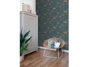 Tmavě modrá hladká vliesová tapeta na zeď, dětské vzory přírody a zvířátek v odstínech hnědé a zelené.
