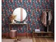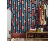 Tmavě modrá hladká vliesová retro tapeta na zeď, geometrický vzor v odstínech tyrkysové, korálové a růžové.