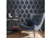 Tmavě modrá vliesová tapeta s hladkým papírovým povrchem, geometrický vzor v barvě bílého zlata.