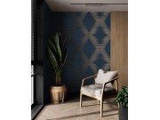 Tmavě modrá vliesová tapeta na zeď, geometrický vzor, linie v barvě mědi tvoří kosočtverce.