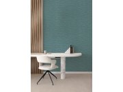 Vliesová tapeta se strukturou rohože, odstíny zelené, modré a zlaté.