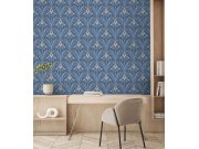 Tmavě modrá vliesová tapeta s vinylovým povrchem, vzor ve stylu Art Deco, kovově lesklé metalické linie.