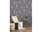Modrá vliesová tapeta na zeď, motivy květin v odstínech modré, hnědé, béžové a růžové.