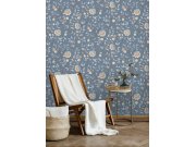 Modrá vliesová tapeta na zeď, motivy květin v odstínech modré, hnědé, béžové a růžové.