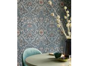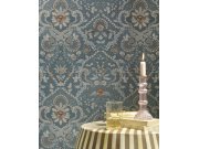 Strukturovaná modrá vliesová tapeta na zeď, zámecký květinový vzor.
