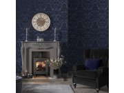 Luxusní tmavě modrá vliesová tapeta s flockovými ornamenty.
