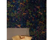 Temně modrá vliesová tapeta na zeď, větvičky, květiny, ptáci, zvířata.