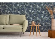 Modrá vliesová tapeta na zeď, motivy listů v odstínech zelené, šedé a fialové.