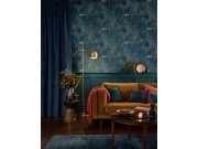Modrá vliesová tapeta na zeď, motiv divoké přírody - stromy, listy, květiny.