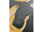 Petrolejově modrá vliesové tapeta na zeď, motivy letících jeřábů v odstínu okrové, šedé a růžového zlata.