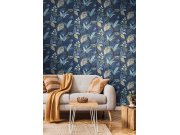 Luxusní modrá vliesová tapeta s vinylovým povrchem, motivy listů, odstíny modré, šedé, černé a zlaté, látková textura.