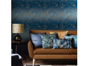 Pololesklá modrá vliesová tapeta na zeď, motivy luční trávy v odstínech modré a měděné.